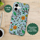Fresh Summer Breeze Floral Phone Case - Flower Pattern orange Swirl Berry Design is hand drawn and shows a seamless repeating floral pattern with green leaves and round orange berries. The main colors in this Pattern are, green, orange, yellow, blue, on a teal blue Background.
