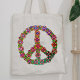 A retro peace sign / peace symbol tote bag with tie dye colors and brightly colored flowers over it. A colorful floral design for proud hippies / lovers of world peace.