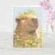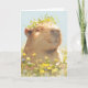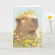 This delightful capybara greeting card features a heartwarming illustration of a contented capybara with closed eyes, basking in a meadow adorned with vibrant wildflowers. The capybara, wearing a gentle crown of greenery, exudes a peaceful and happy vibe, perfect for animal lovers and nature enthusiasts. The soft watercolor style enhances its whimsical charm, making it an ideal choice for those who appreciate tranquil animal art and adorable wildlife scenes. Perfect as a gift or keepsake, this card brings a touch of nature's serenity.