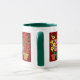 A ringer mug with a green lip and handle and a row of pots of colorful flowers, from a handpainted paper collage by Judy Adamson. Customizable.