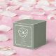White line art flower botanical illustration with white text and hand drawn border over Sage Green background.