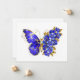 Jewelry, blue, sapphire, sparkling flower butterfly with wing decorated with blue, precious flowers with gold leaves on white background.