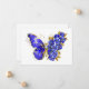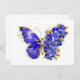 Jewelry, blue, sapphire, sparkling flower butterfly with wing decorated with blue, precious flowers with gold leaves on white background.