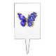Jewelry, blue, sapphire, sparkling flower butterfly with wing decorated with blue, precious flowers with gold leaves on white background.