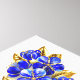 Jewelry, blue, sapphire, sparkling flower butterfly with wing decorated with blue, precious flowers with gold leaves on white background.