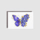 Jewelry, blue, sapphire, sparkling flower butterfly with wing decorated with blue, precious flowers with gold leaves on white background.