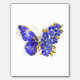 Jewelry, blue, sapphire, sparkling flower butterfly with wing decorated with blue, precious flowers with gold leaves on white background.