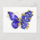 Jewelry, blue, sapphire, sparkling flower butterfly with wing decorated with blue, precious flowers with gold leaves on white background.