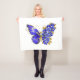 Jewelry, blue, sapphire, sparkling flower butterfly with wing decorated with blue, precious flowers with gold leaves on white background.