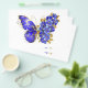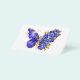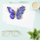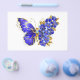 Jewelry, blue, sapphire, sparkling flower butterfly with wing decorated with blue, precious flowers with gold leaves on white background.