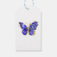 Jewelry, blue, sapphire, sparkling flower butterfly with wing decorated with blue, precious flowers with gold leaves on white background.