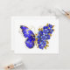 Jewelry, blue, sapphire, sparkling flower butterfly with wing decorated with blue, precious flowers with gold leaves on white background.