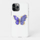 Jewelry, blue, sapphire, sparkling flower butterfly with wing decorated with blue, precious flowers with gold leaves on white background.