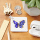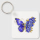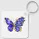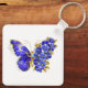 Jewelry, blue, sapphire, sparkling flower butterfly with wing decorated with blue, precious flowers with gold leaves on white background.