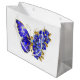 Jewelry, blue, sapphire, sparkling flower butterfly with wing decorated with blue, precious flowers with gold leaves on white background.