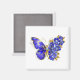 Jewelry, blue, sapphire, sparkling flower butterfly with wing decorated with blue, precious flowers with gold leaves on white background.