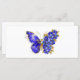 Jewelry, blue, sapphire, sparkling flower butterfly with wing decorated with blue, precious flowers with gold leaves on white background.