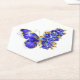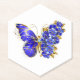 Jewelry, blue, sapphire, sparkling flower butterfly with wing decorated with blue, precious flowers with gold leaves on white background.