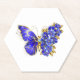 Jewelry, blue, sapphire, sparkling flower butterfly with wing decorated with blue, precious flowers with gold leaves on white background.