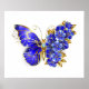 Jewelry, blue, sapphire, sparkling flower butterfly with wing decorated with blue, precious flowers with gold leaves on white background.