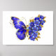 Jewelry, blue, sapphire, sparkling flower butterfly with wing decorated with blue, precious flowers with gold leaves on white background.