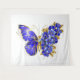 Jewelry, blue, sapphire, sparkling flower butterfly with wing decorated with blue, precious flowers with gold leaves on white background.