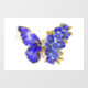 Jewelry, blue, sapphire, sparkling flower butterfly with wing decorated with blue, precious flowers with gold leaves on white background.