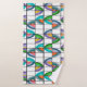 This towel set has a yellow washcloth, an orange hand towel, and a bath towel with a Boho design of flowers inside ovals that have been split into quarters and placed on a grid.
