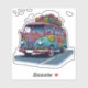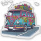 A vibrant retro van decorated with an array of colorful flowers and playful stickers travels down a winding road. The vehicle is topped with a stacked assortment of luggage, evoking a spirit of adventure and freedom under a serene sky.