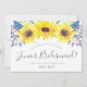 Rustic floral bridal party proposal card features a top border of yellow watercolor sunflowers and navy blue wildflower buds. Personalize with your jr. bridesmaid request details (shown with "will you be my junior bridesmaid? I can't say I do without you") in modern hand lettered script and traditional serif lettering. Invitations reverse to rich harbor blue.