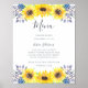 Charming rustic wedding menu sign displays your dinner selections in chic handwritten calligraphy and classic serif lettering. Adorned with borders of yellow watercolor sunflowers and navy blue wildflower buds that match our country chic Flowerfields wedding collection.