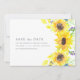 Our Flowerfields save the date card features your key wedding details (names, wedding date, location and website) accented by vibrant yellow watercolor sunflowers and navy blue and purple wildflower buds.