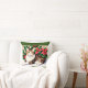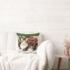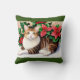 A square throw pillow with a green border features a watercolor-style painting of a tabby cat lying in front of poinsettias and holly. The cat has brown and tan stripes, a white chest, and yellow eyes. It is lying on a white surface, and the background is filled with red poinsettias and green holly leaves. The painting has a soft, watercolor effect, with gentle shading and blending of colors.