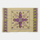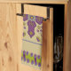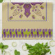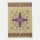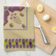 This kitchen towel's design, art by Kristie Hubler, involved inspiration from jewelry and textiles from all around the world, around the equator, from archways, to flowers, to swags of floral sprays with dangling jewels, to eggs with flowers and jewels placed inside with a ribbon wrapped around it. In cool colors of purples, violets, sage, chartruese, and a muted periwinkle, on a tan background.