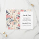 Save the date card with a lovely French themed pattern. Pretty flowers and an Eiffel tower and butterflies. Colors include pink, blue, peach and cream.