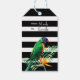 Exotic orange flowers and colorful parrot seamless pattern over white background. Customizable gift tag template