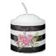 Chic wedding votive candle favor done in a black and white bold horizontal stripe. Pretty watercolor artwork of pink peonies decorates the middle front. Custom pink script text reads Thank You.