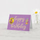 A feminine lavender-purple colored birthday greeting card for women. This card features a bouquet of watercolor flowers, pansies, and a stack of cute teacups.