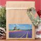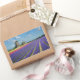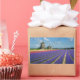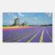Rectangular photo sticker with purple and pink hyacinth flowers and three windmills in a landscape in the Bulb Region in the Netherlands.