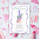 Birthday invitation card featuring watercolor illustration of number one with wild flowers and purple ribbon.