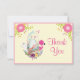 A baby shower thank you card decorated with pink and green floral elements. Illustrated with a cute watercolor egg sitting inside a brown wicker basket. The basket is decorated with ribbons, bows, flowers and little hearts too. A pink flamingo and white bunny rabbit standing on either side. A thin pink border surrounds the outside. The back of the card is decorated with pretty flowers and a pink ribbon with "Thank You" written inside. There is a message on the back which you can personalize with your own text and name.
