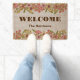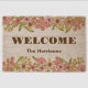 Greet your guests with a beautiful personalized welcome doormat created using hand drawn watercolor florals in pinks, yellows, and greens. Makes a great housewarming gift! Original art by Leslie Larson.