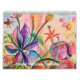 I enjoy drawing colorful imagined flowers. All the drawings in this calendar are original art created in watercolor and ink on paper. Flower drawings and landscape are a departure for me as in the past I have usually been interested in abstraction. This calendar gives a lovely flower for each month and I hope the designs are cheerful and friendly. I chose a color for each month that would be a complement to the flowers drawn.