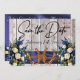 This design has a rustic elegance, keeping it simple theme. barnwood background with dusty blue ribbon, knotted horseshoes and wildflower bouquets with placeholders for the date on the front. Placeholder for a photo of the couple is on the back of the card with names, and "Gettin' Hitched" script on matching ribbon background. Designed to coordinate with "Gettin' Hitched - Horseshoes, Ribbon & Lace" Collection. To change details, click «Personalize». To move the text or change the text size, font, or color click «Click to customize further»