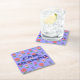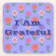 This coaster displays a seamless floral pattern design on a solid light blue background. The pattern features large coral-pink flowers with yellow centers, smaller pink daisies with white petals and yellow centers and royal blue flowers with yellow centers. I Am Grateful is on the coaster in a blue color. Each flower has a green stem and 2-3 small green leaves. The coaster is a paper pulp coaster in a square shape with rounded corners. The coaster set contains six coasters.