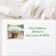 Pretty return address labels with a beautiful illustration of white flowers in a copper pot with a back view of a serene lake with pine trees.