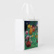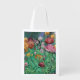 I own a lot of reusable grocery bags, but this one holds its box shape and simply stands up on its own even if there is nothing in it. Its stiffer than your regular reusable bag too, and the material is water resistant. I poured water on the exterior and it didn't penetrate inside to the other side. I'm buying a couple more. Wish I knew how durable these bags were or I would have purchased a few more with my initial order. I also like how it folds and buttons up when not in use, making it easy to put into a handbag or luggage. I haven't used this bag yet, as I purchased it for travel use, like when you're at the airport and need to small sturdy bag to place any airport purchases in, like food, souvenirs etc. I can tell you when you first see this bag, it looks very cheap, but after closer inspection of the material and the seams its a very sturdy reusable bag. I tested it out by putting some really heavy objects inside and I could not observe any stress to the bag at all. Another thing I like about it, is the fact the medium size that this is makes it easy to just carry it in your hand without the bottom of the bag scraping the ground, like most other bags do when you're short. That alone, deserves 5 stars. I just wish there were more colors to choose from! The PDX Airport Carpet printing looks just like the photo, and using this bag during travel might be a conversation piece when/if a native from Oregon happens to see it.