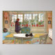 Little girl watering colorful flowers in the window. Detailed spring-like watercolor by Carl Larsson.