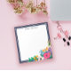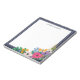 Lovely personalized notepad with your name in modern dark blue letters. In the bottom right corner, flowers in white, hot pink, purple, and yellow grow along with greenery and berries. A yellow butterfly sits atop a purple rose. The floral notepad has a dark blue border.