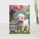Designed with a soft spring scene, this card features a fluffy white young lamb slightly right of center, facing forward with wide shining eyes and faint rosy cheeks that give it a tender, friendly look 🐰. A purple bow sits neatly at its neck, standing out against the textured white coat. The background shows green grass stretching across the bottom and a teal sky above, keeping the palette gentle and airy. On the left, a sturdy tree trunk rises into an arching canopy of small pink blossoms, like a protective cover over the scene 🌷. Beneath the tree, a rustic wooden crate holds several pastel oval treats nestled in grass, while a small yellow winged insect hovers nearby. More pastel ovals and tiny pink flowers dot the foreground, and the lamb’s calm gaze feels like it’s sharing the moment with someone close. The occasion text appears on the front face of the crate in clear, light-colored lettering, while a few more yellow winged insects float near the blossoms overhead.